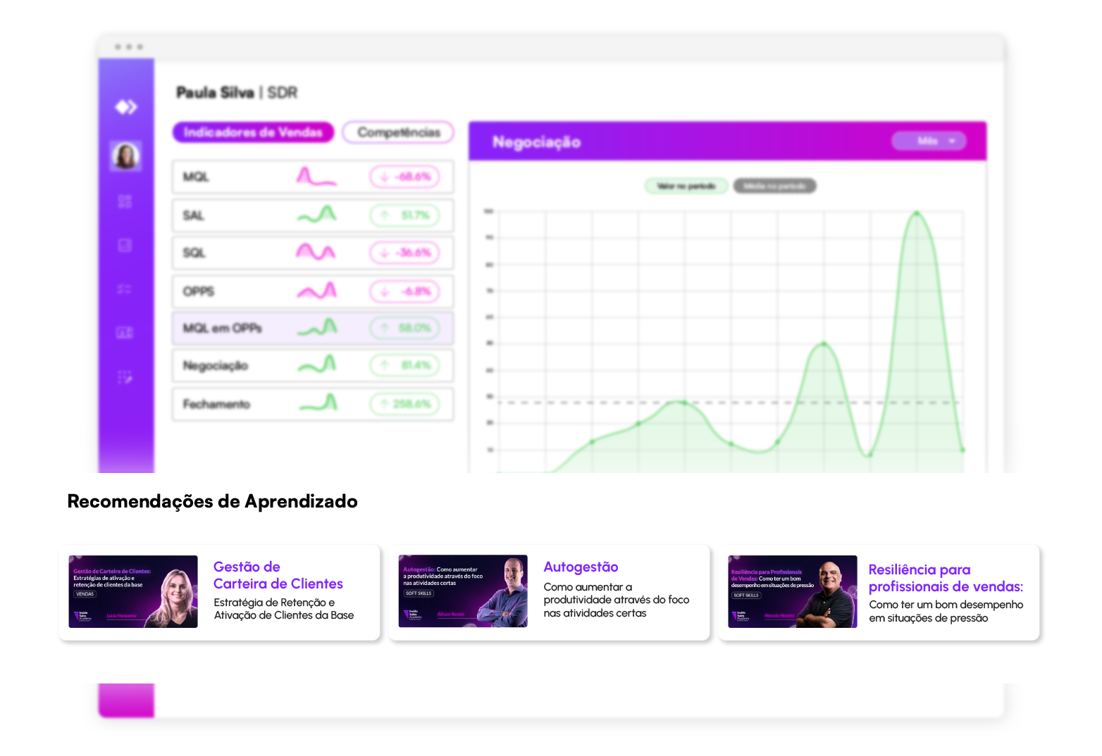Acompanhe com rapidez e profundidade: mapa de desempenho, ranking de vendedores, evolução por indicadores, análise de competências e uma área exclusiva de Enablement com insights prontos para aplicar.Tudo o que você precisa para liderar com dados e acelerar resultados.